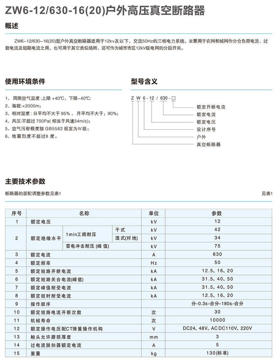 ZW6-12/630-16(20)户外高压真空断路器